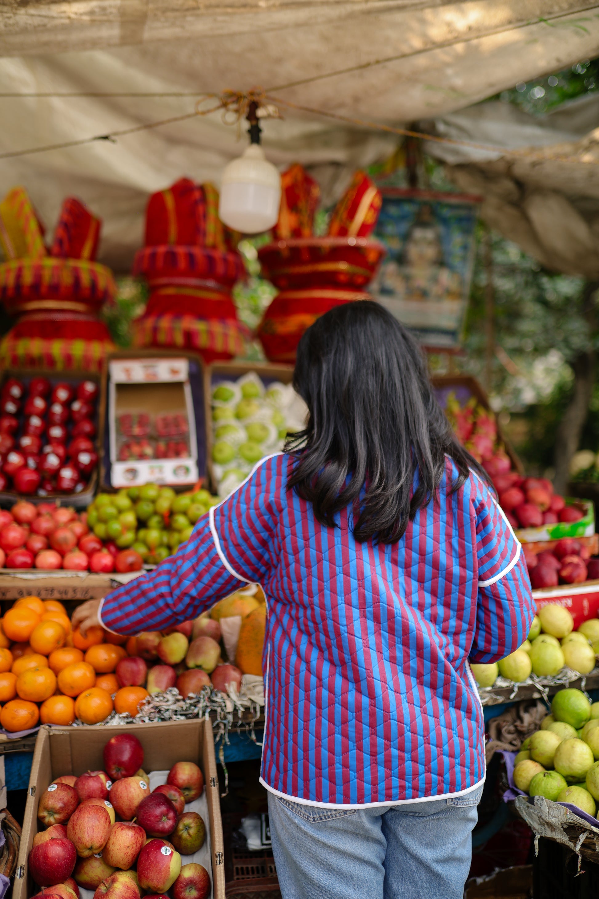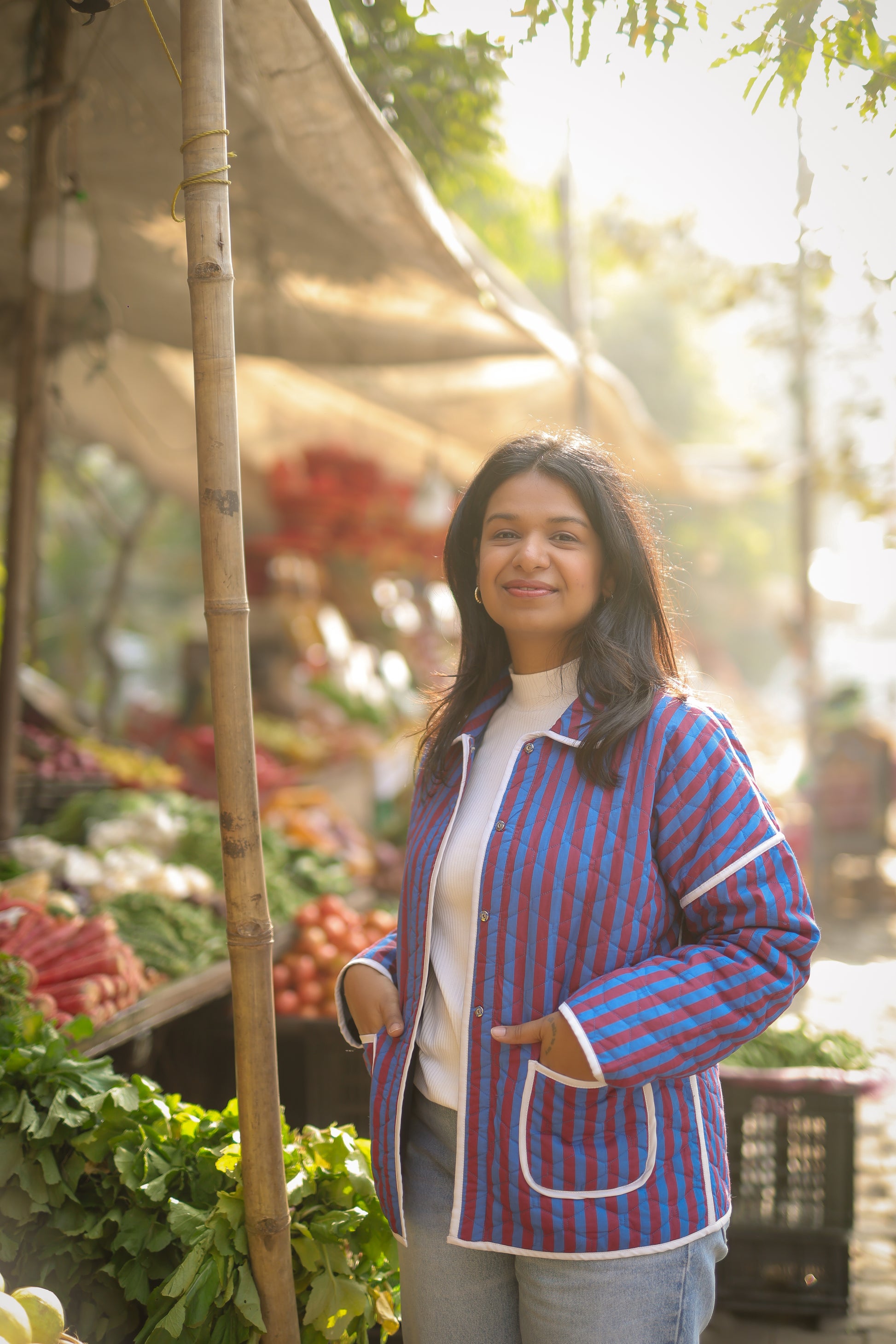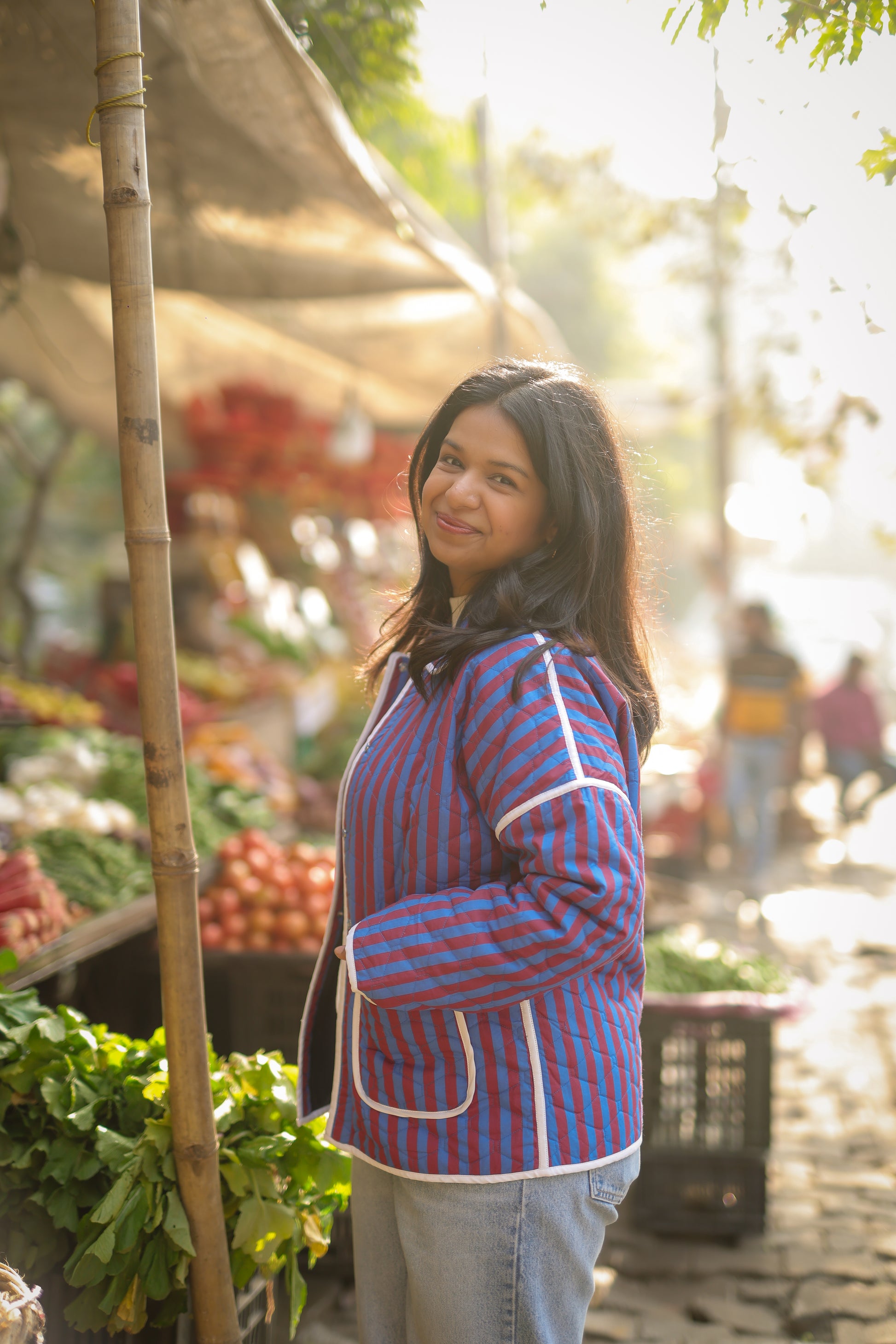 Quilted in striped printed cotton, this jacket features delicate piping and easy side pockets. A relaxed layer that feels playful, polished, and effortless.